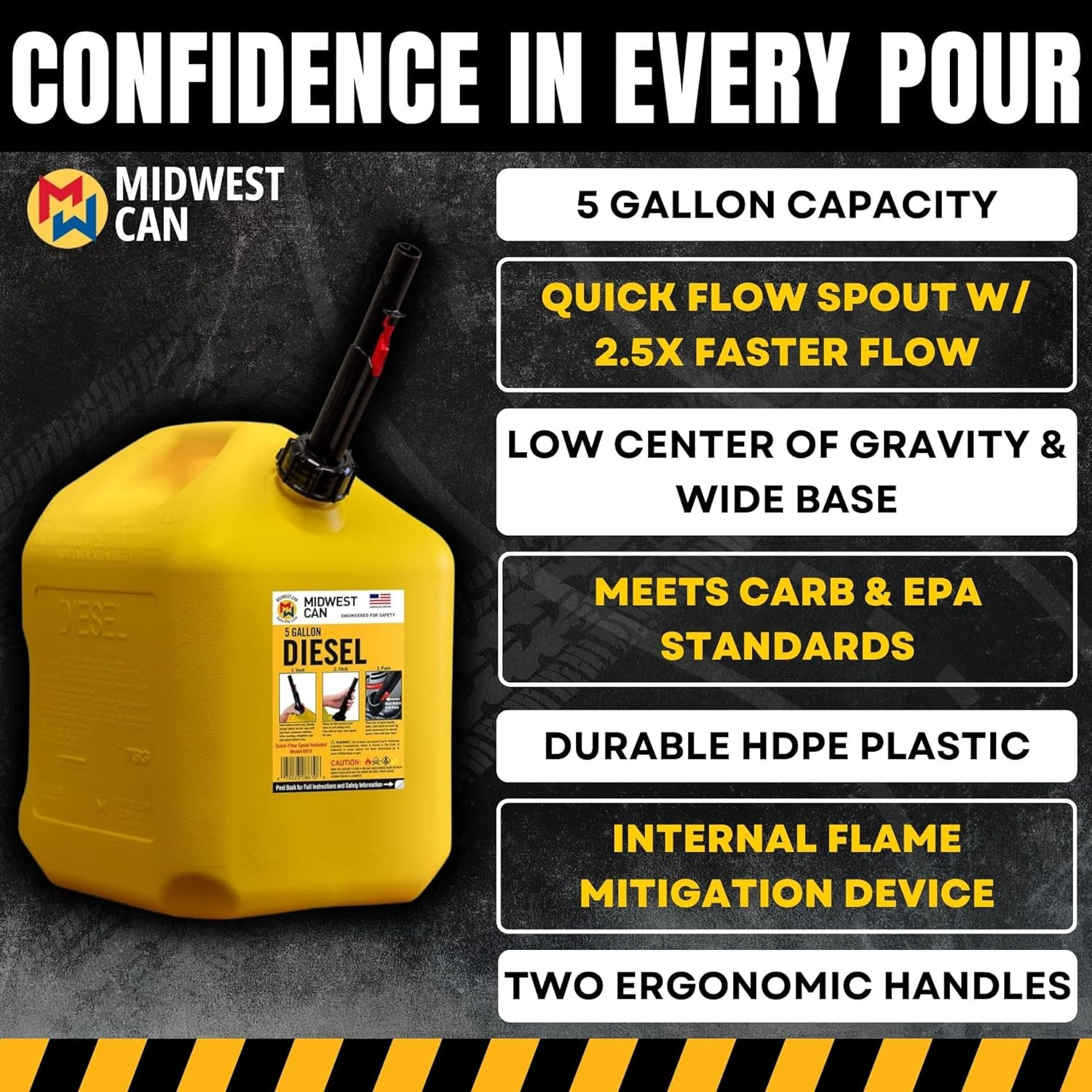 Midwest Can Company 8610 EPA and CARB Compliant 5 Gallon Diesel Can Fuel Container with Flame Shield Safety System and Auto Shut Off (2 Pack)