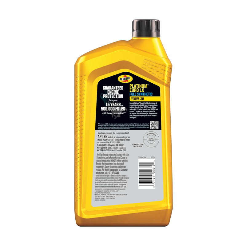 Pennzoil Platinum Euro LX Full Synthetic 0W-30 Diesel Engine Oil, 1 Quart (Case of 6)(550043041)