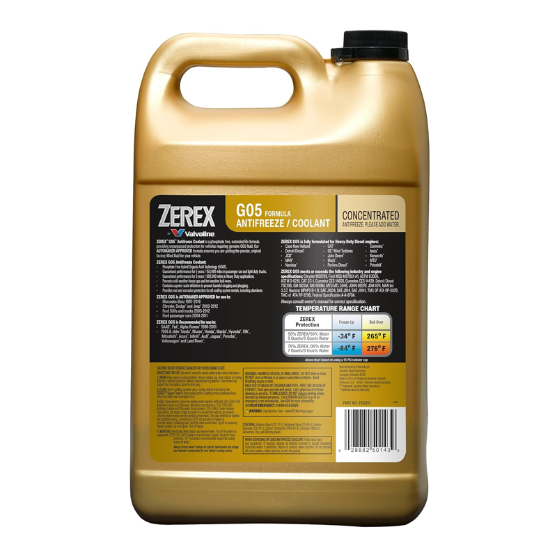 - ZEREX G-05 contains a high quality defoamer system and will not harm hoses, plastics or original vehicle finishes